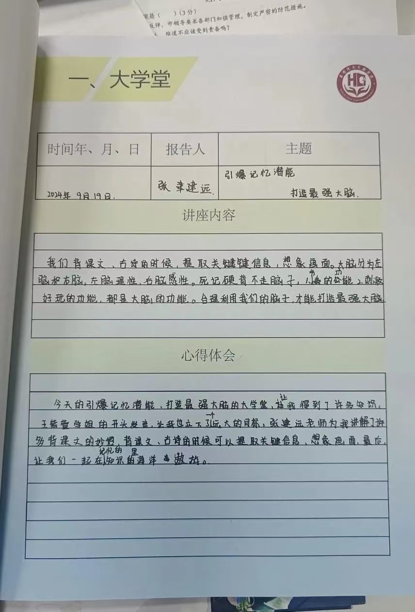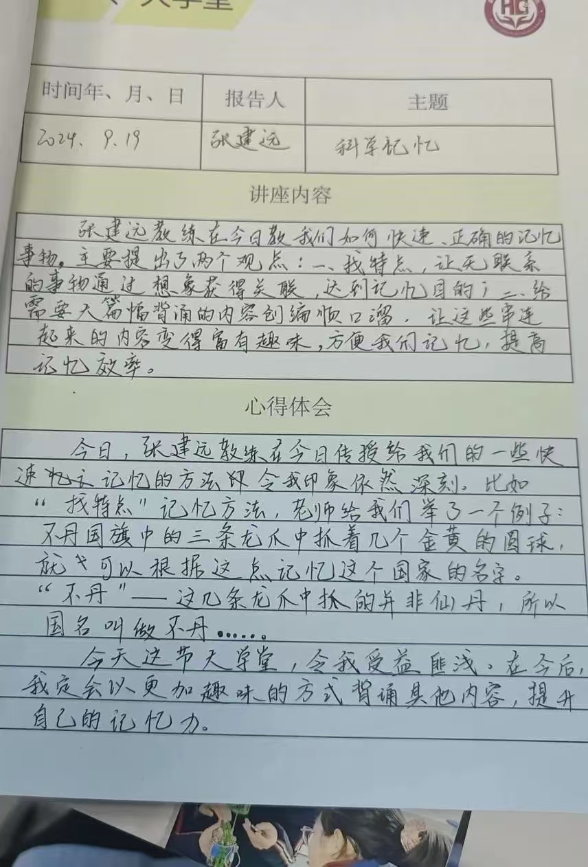 一个小时的讲座的在学生的笑声中结束,但那意犹未尽的眼神分明在说,右脑记忆不仅能提高记忆效果,还能集中注意力,让学习变得有趣。会后,中学部的同学进行了总结。右脑记忆的好处深入人心。
